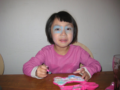 Ég var að fá myndir frá henni Hafdísi vinkonu minni sem hún tók af Önjuskottinu mínu og ómægod hvað þær eru fyndnar!! Þetta skott sem mér var falið er alger "kremdolla" æ þið vitið hvað ég meina, snyrtipinni!! Helst mundi hún fara máluð í leikskólann og nokkru sinnum hefur hún reynt að smygla varalitum með!!! Hvaðan hefur barnið þetta?? Getur málingar og kremæði verið genetíst?? Spurning hvort Kári verði ekki að kíkja á þetta, því ekki hefur stelpan þetta frá mér! LOLOL